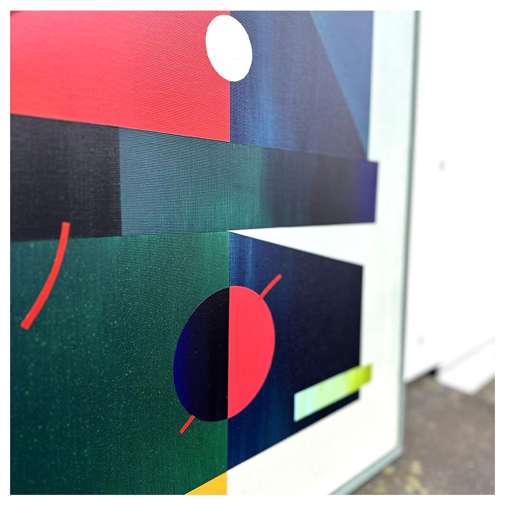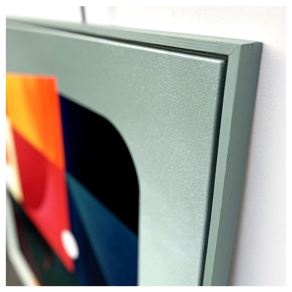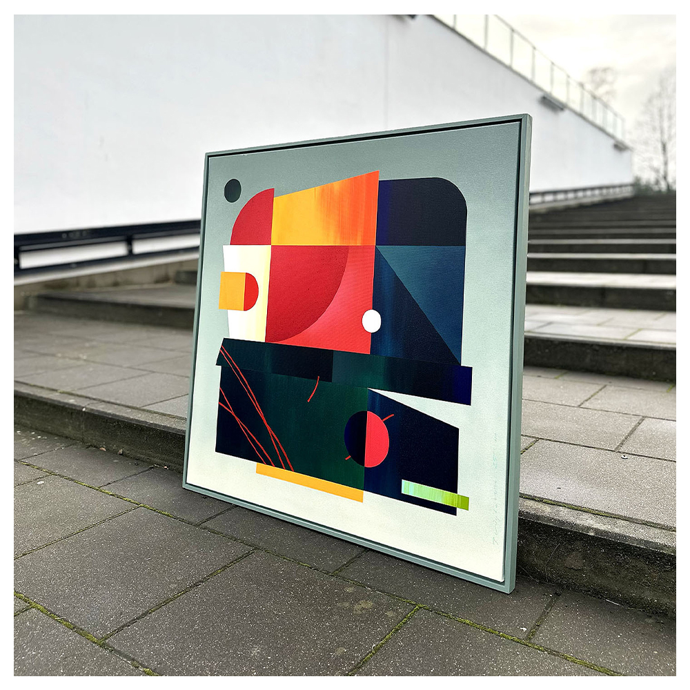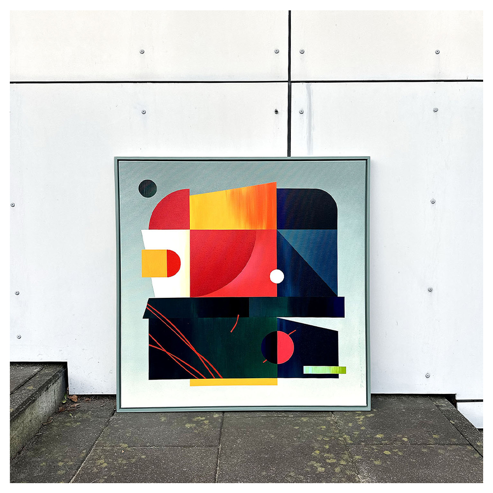 Teal Drift to obraz oparty na kontraście pomiędzy spokojną, turkusową przestrzenią a eksplozyjnym, kolorowym centrum kompozycji. Praca balansuje między kontrolą geometrii a żywiołowością gestu i faktury, tworząc napięcie, które nadaje całości wyrazisty, współczesny charakter.