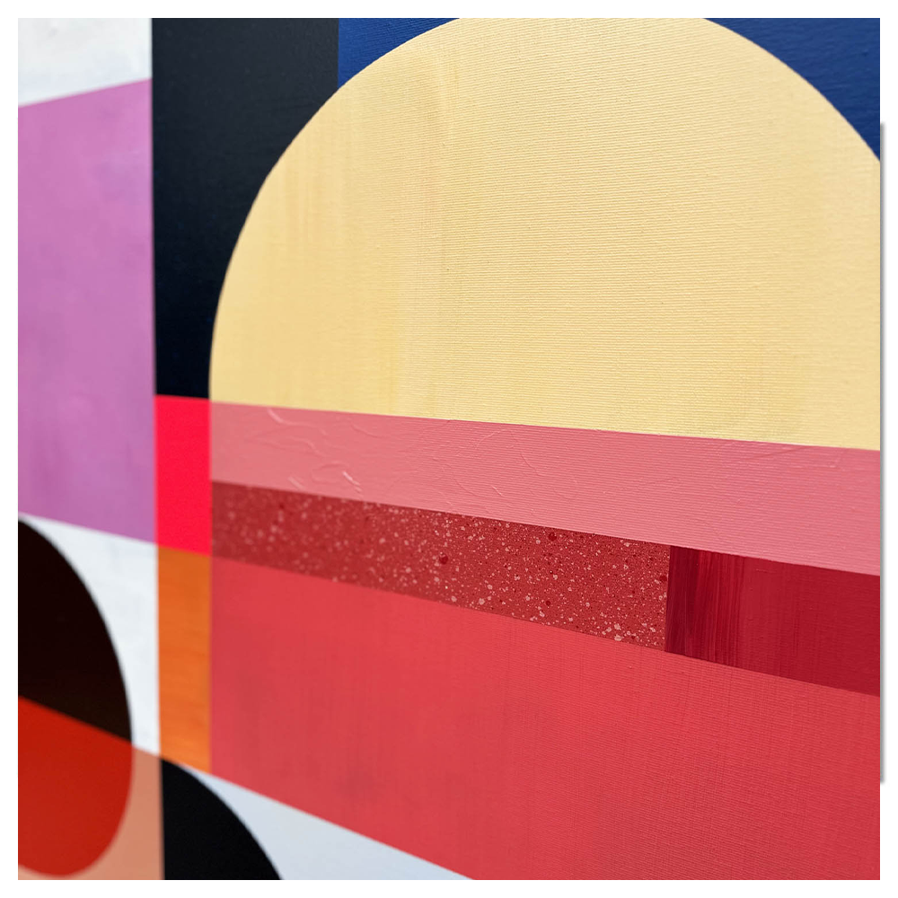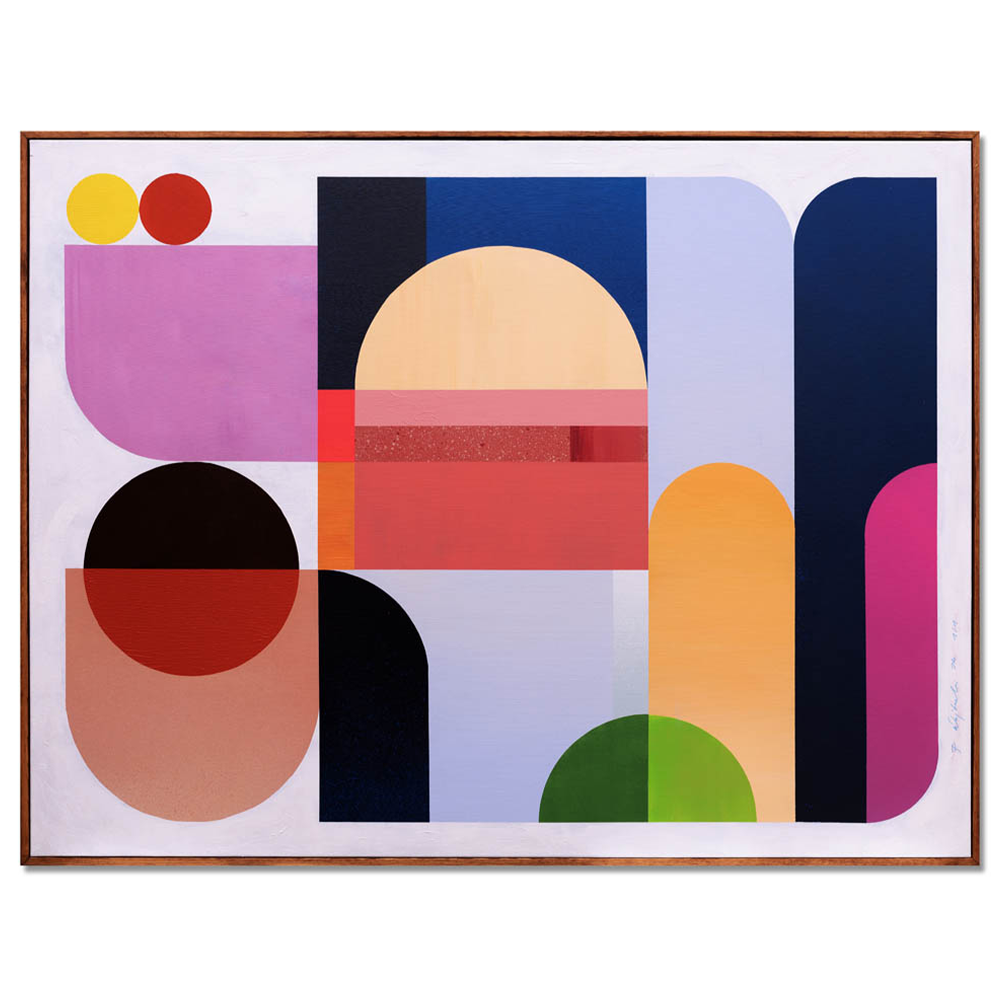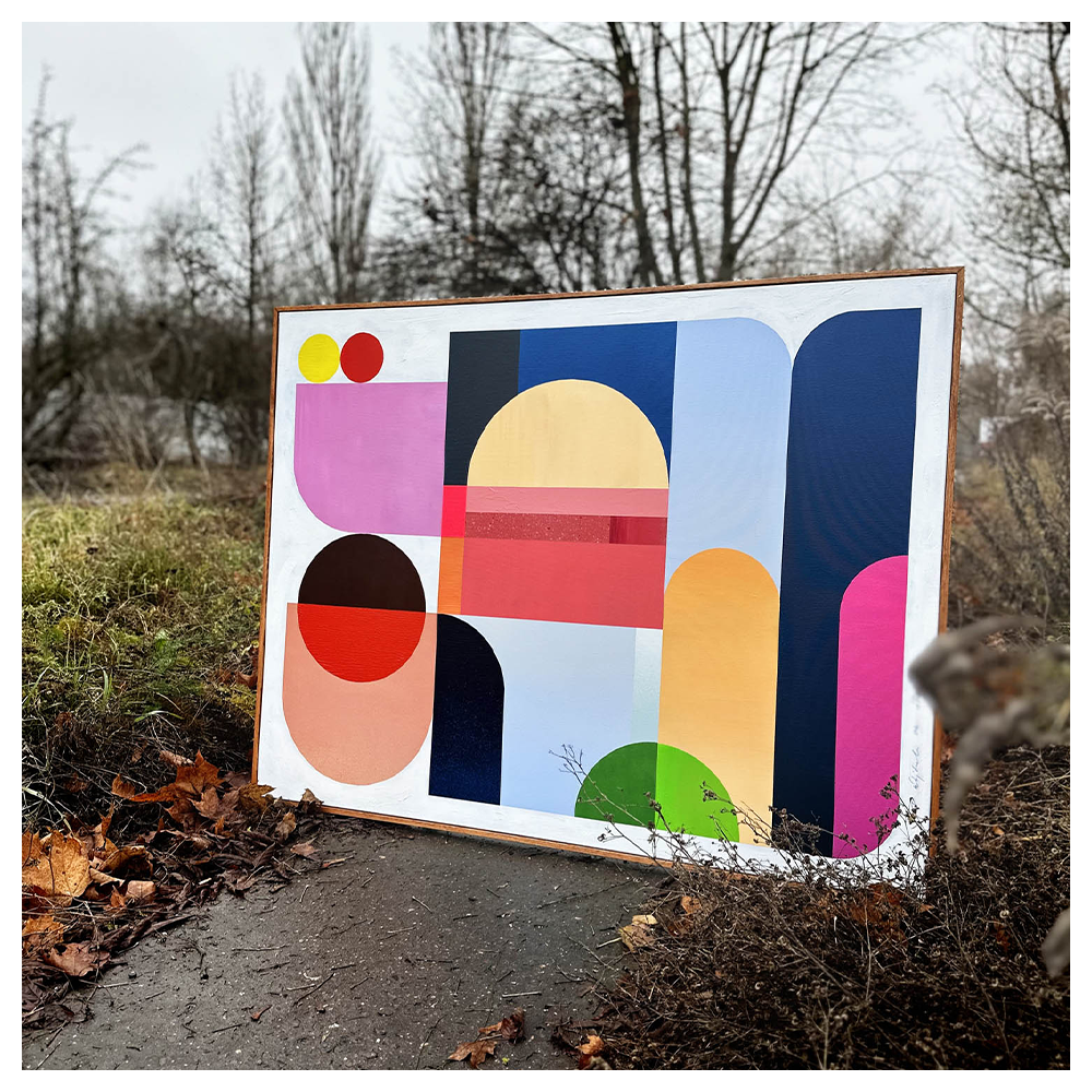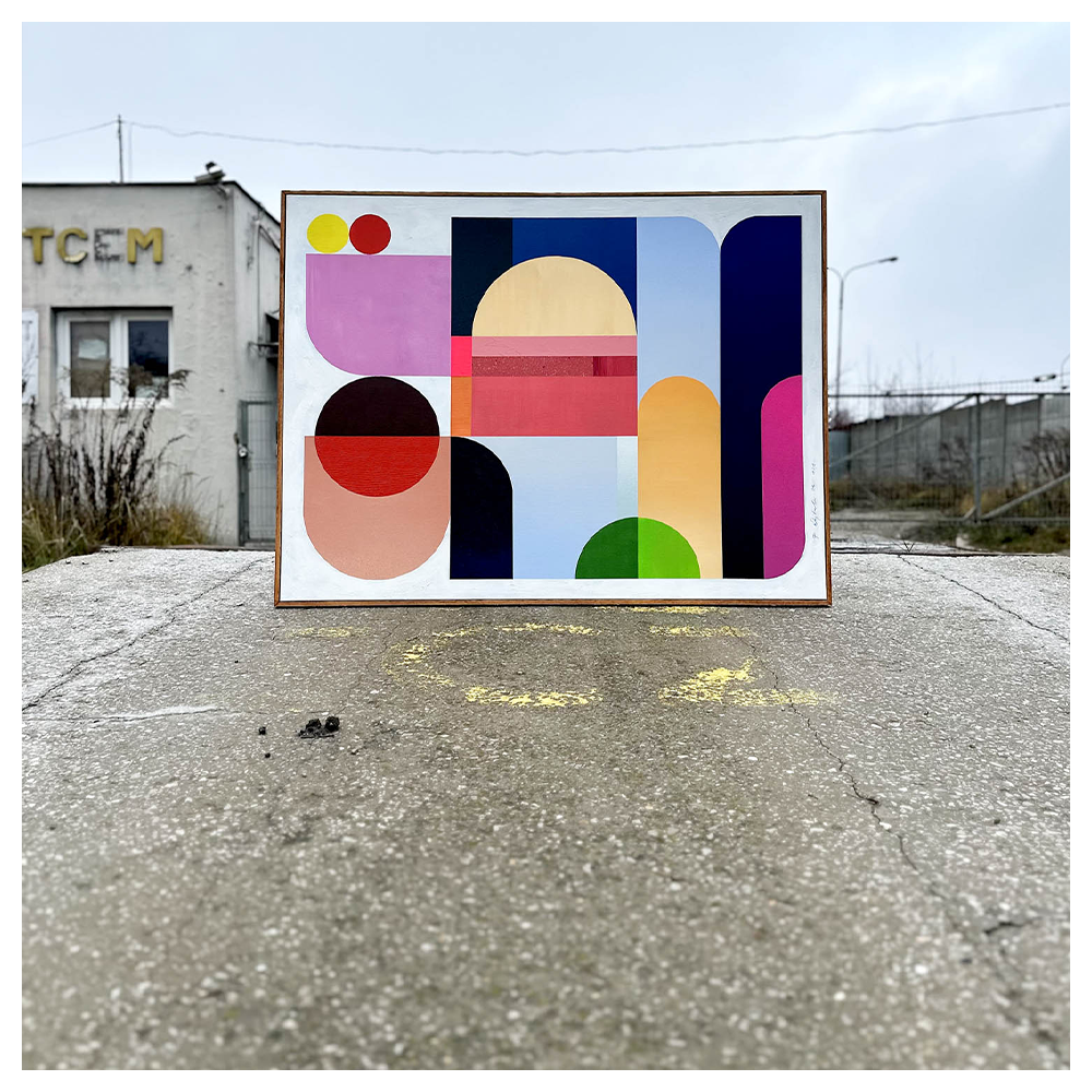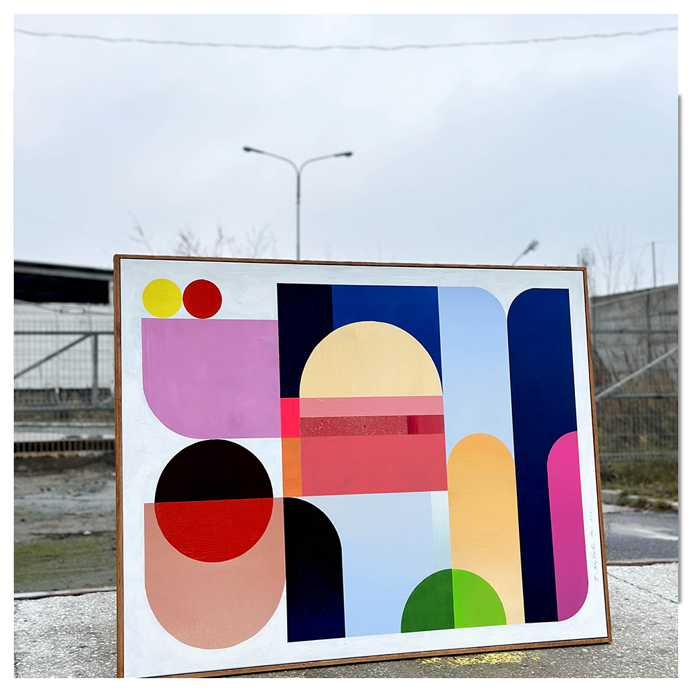 Zestawienie barw: tęczowy, cyan, magenta, szerokie spektrum barw, kalejdoskop, mnogość figur, duży format nadaje kompozycji szlachetny, wyważony charakter. Kolory pracują tu bardziej jak światło i cień niż jak klasyczne plamy barwne, dzięki czemu obraz zmienia swój odbiór w zależności od otoczenia.
