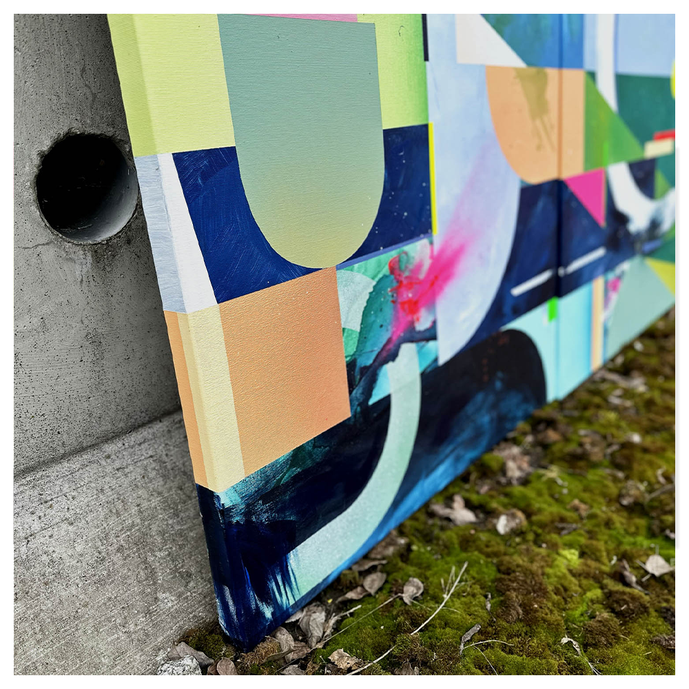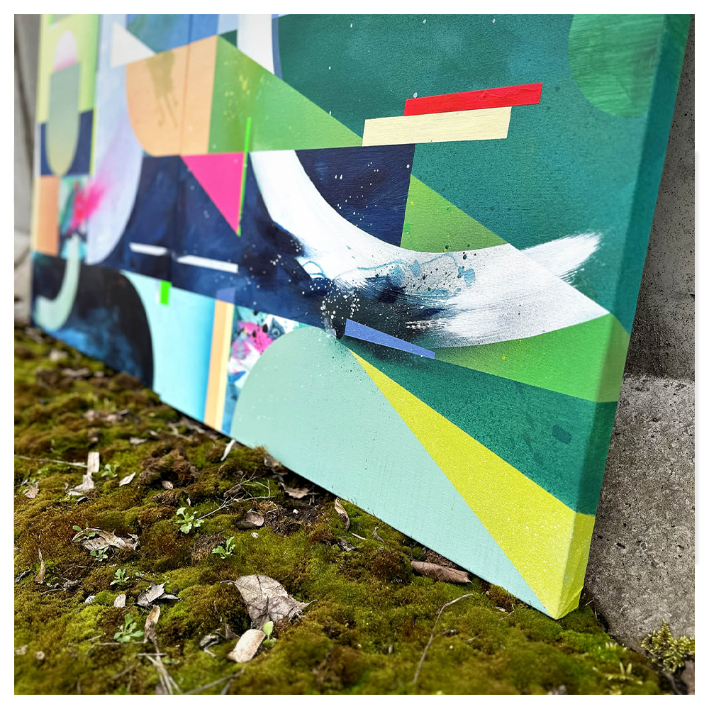Forest Whispers to obraz, w którym punktem wyjścia jest idea porządkowania chaosu poprzez formę i kolor. Inspiracje zawarte w tej pracy nie są opowiedziane wprost – zostały przełożone na język abstrakcji geometrycznej, gdzie znaczenie budują relacje między płaszczyznami, rytm podziałów i napięcia kompozycyjne.