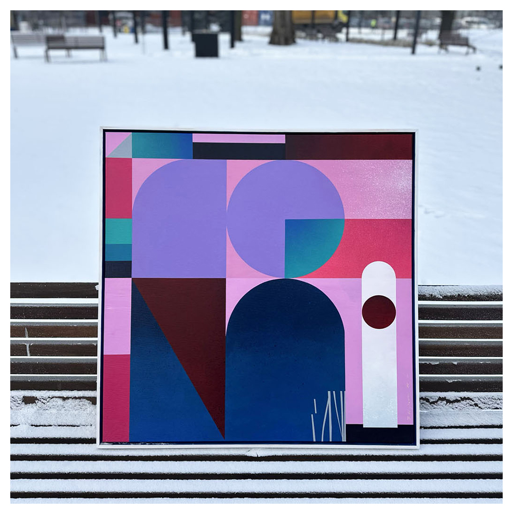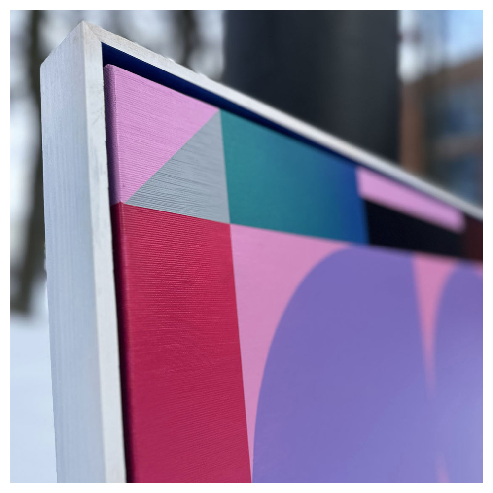 Violet Parallax to obraz inspirowany zjawiskiem przesunięcia perspektywy oraz optyczną grą głębi i warstw. Kompozycja została zbudowana w języku abstrakcji geometrycznej, gdzie kolor, struktura i precyzja form tworzą wrażenie wielowymiarowości i subtelnego ruchu.