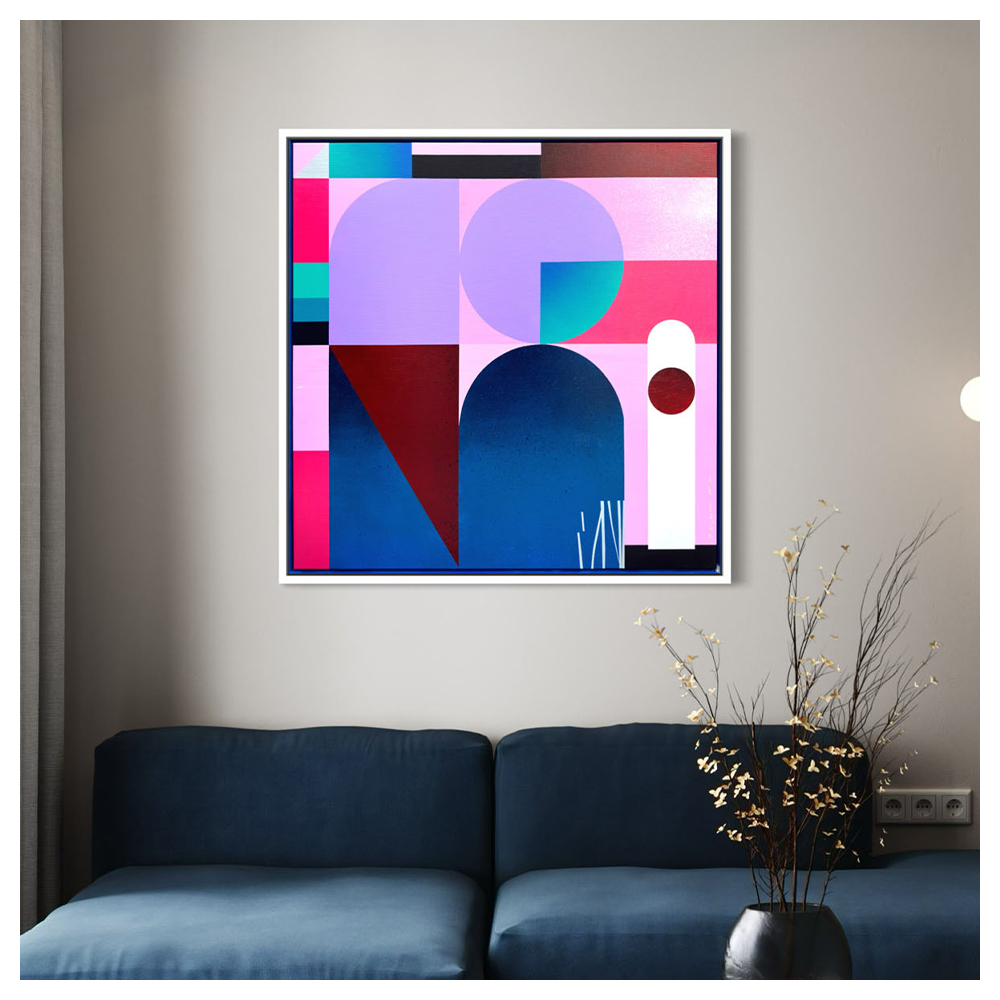 Format 100 × 100 cm sprawia, że Violet Parallax stanowi mocny, ale wyrafinowany akcent we wnętrzu — obraz, który przyciąga uwagę kolorem, ale zostaje w pamięci dzięki klasie i głębi.